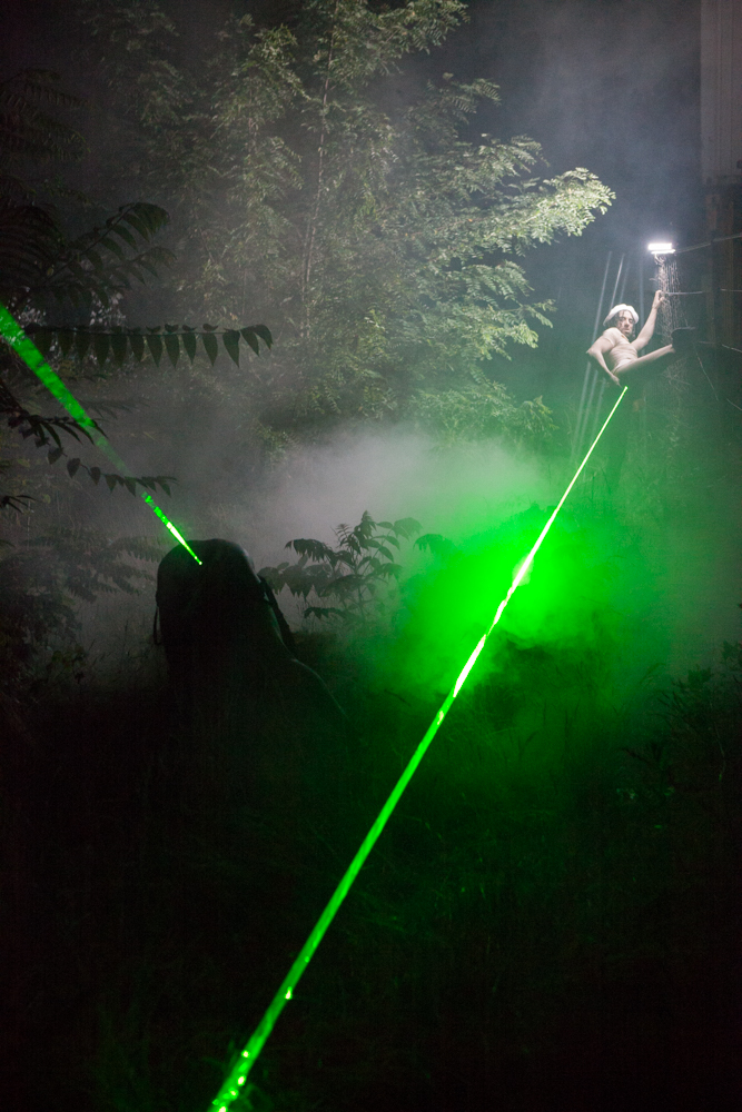 „When Doves Cry“ zeigt die künstlerische Auseinandersetzung des Fotografen Spyros Rennt und Musik-Komponisten Billy Bultheel mit dem Bonjour Tristesse Wohnhaus in Berlin-Kreuzberg. Über den Hinterhof und eine Wohnung führt der Kurator Joel Mu die Zuschauer in Etappen hinauf auf’s Dach. Der private Raum wird durch zufällige Treffen, private (Sex-)Partys, Schlafwandel und einen Klang-Leuchtturm künstlerisch inszeniert. Billy Bultheels neue, von Monique Wittigs Roman „Le Corps Lesbien“ (1973) inspirierte Komposition für Countertenor und Tuba gibt all dem einen Rahmen.