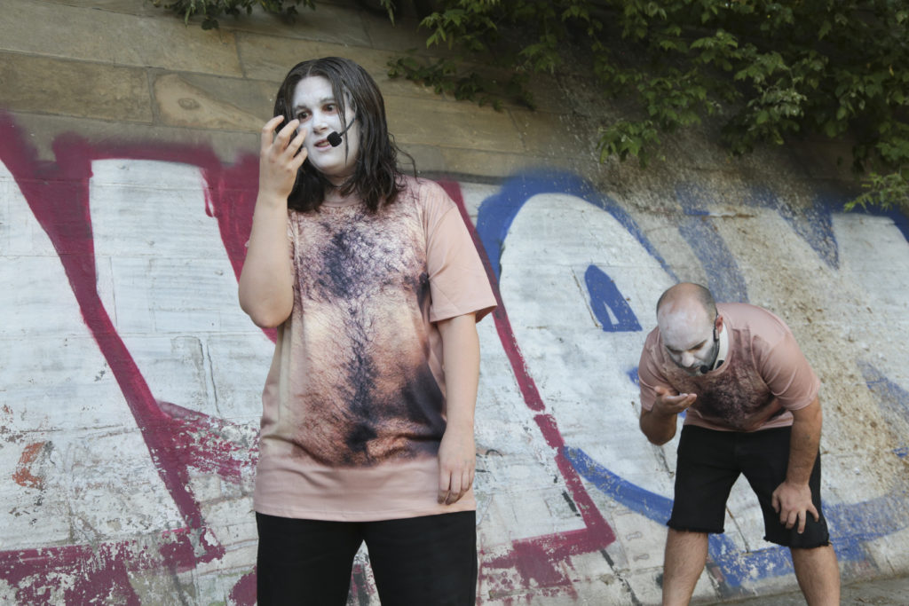 Georgia Gardner Grays neues Stück „Pigeon Feather Stick“ folgt dem titelgebenden Protagonisten durch die Traumlandschaft seiner eigenen Herkunft und körperlichen Daseinsformen. Teils Aussätziger und Urmensch, teils Beatnick, Kriegsveteran und Vogel, Pigeon Feather Stick ist eine wild undefinierte Mischung aus Mensch und Tier. Obwohl überaus fruchtbar, ist unklar, ob er einfach nur fett ist oder Eier legen kann. Sein fleischiger Freund Non-Binory Sirloin Steak ist im wahrsten Sinne des Wortes ein Stück Fleisch am Haken. Indem er die Grenzen zwischen dem, was ‚natürlich‘ und was ‚kulturell‘ ist, kontinuierlich verwischt, macht Pigeon Feather Stick die beunruhigende Nähe der beiden Figuren deutlich. In widerspenstiger Manier warnt uns seine Satire vor den allgegenwärtigen Tücken unserer Selbstwahrnehmung. In „Pigeon Feather Stick“ sind die Menschen unnütz – von Bäumen kackende Tiere und grunzende Affen.