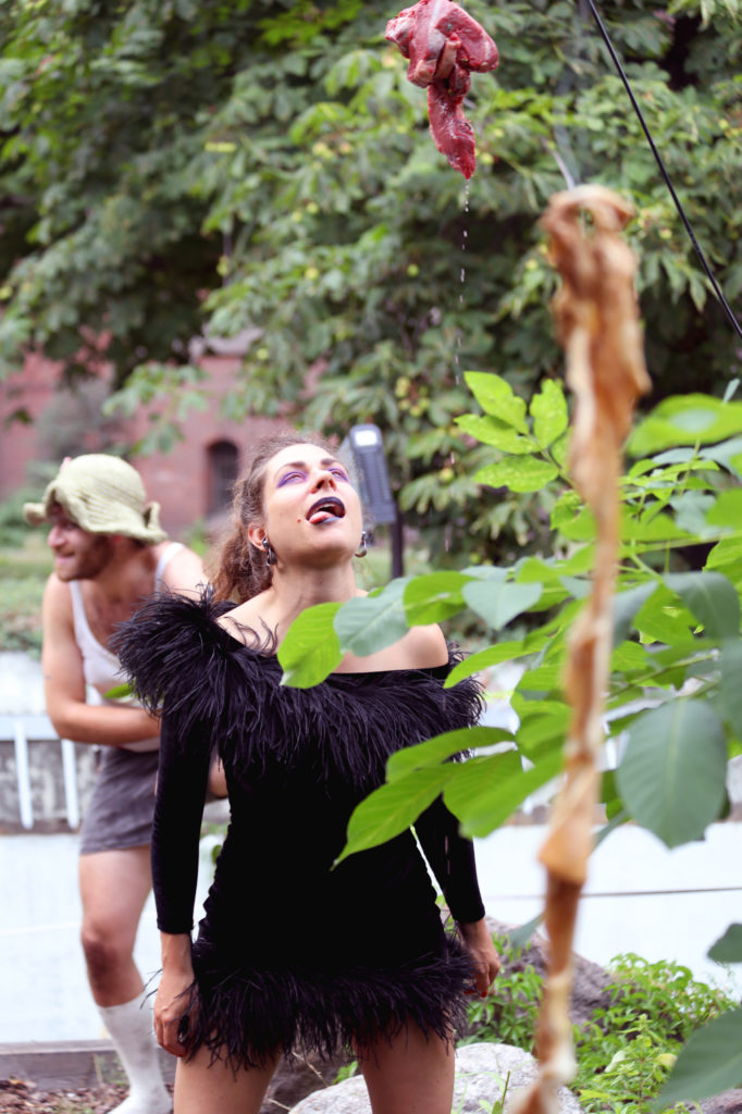 “Pigeon Feather Stick”, a play by Georgia Gardner Gray, follows the eponymous protagonist through a dreamscape of his own genealogy and bodily functions. Part outcast, part prehistoric man, part beat-nick, part war veteran, part bird, Pigeon Feather Stick is a blur between a human and an animal. Strangely fecund, it’s hard to tell if he is just fat or able to lay eggs. Non-Binary Sirloin Steak, his meaty friend, is in fact a piece of beef hanging from a string. Constantly overstepping the limit between ‘nature’ and ‘culture’, Pigeon Feather Stick exposes their uneasy vicinity, while his ornery satire warns us of the dangers implicit in our self-conception. Pigeon Feather Stick shows humans to be useless animals shitting from trees and grunting like apes.