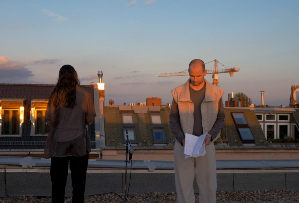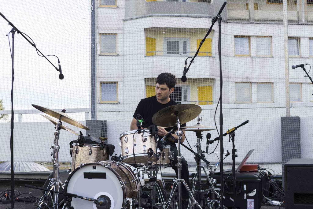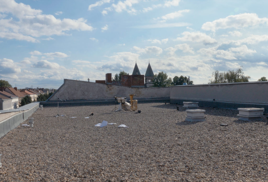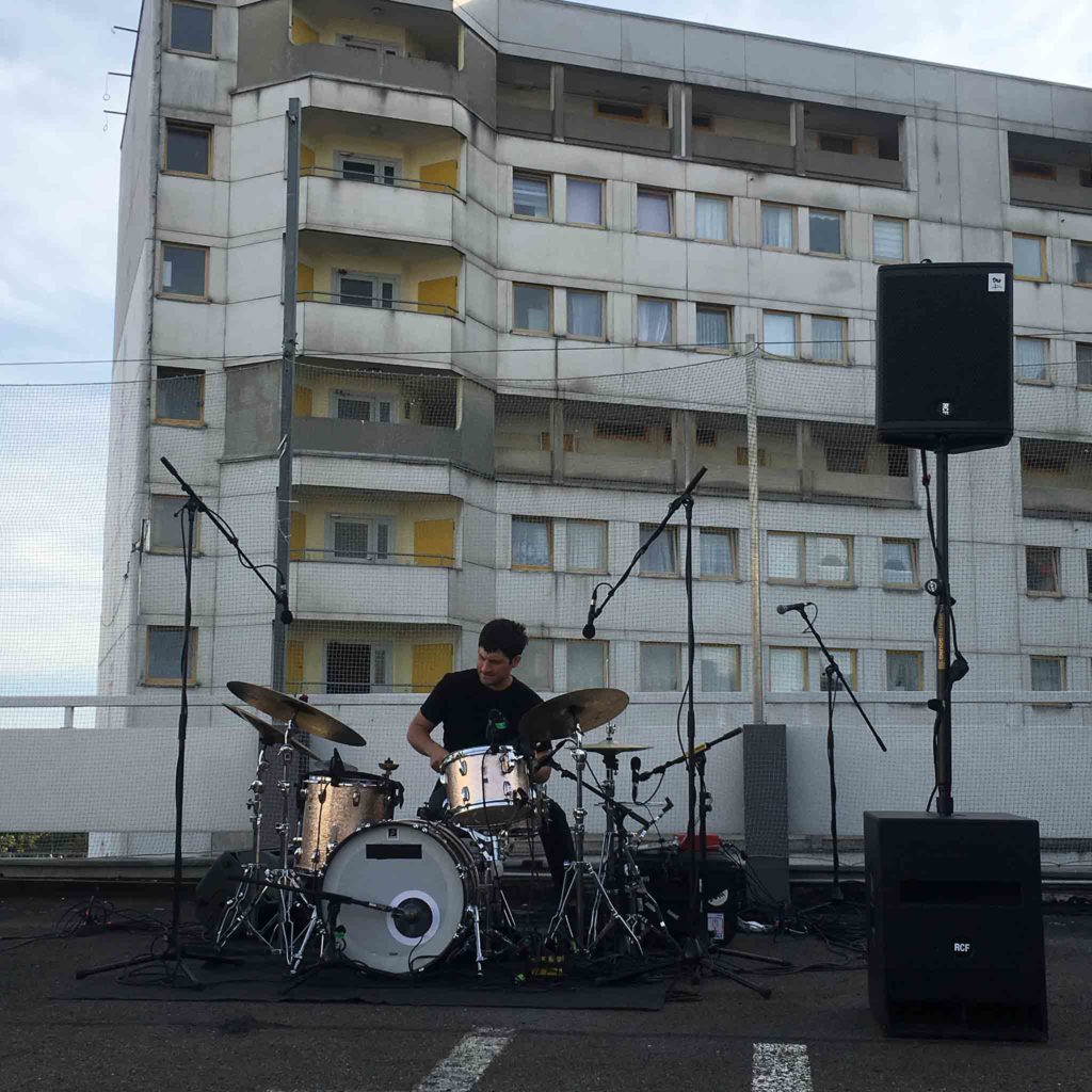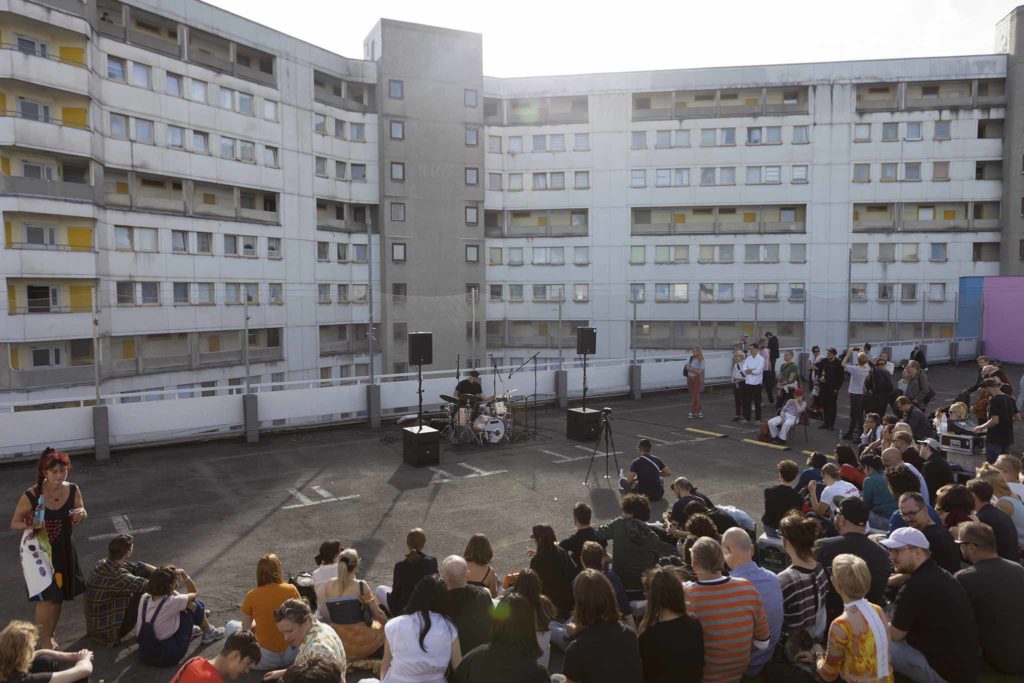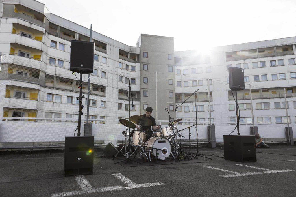 By mixing his own compositions with various live-recorded sounds at Kottbusser Tor, the composer and percussionist Eli Keszler transports the reality behind and underneath that of which is captivating our sight on towards the rooftop of a carpark. The site-specific sound performance addresses our auditory and visual perception of social and architectural reality. Located behind the Zentrum Kreuzberg, formerly named Neues Kreuzberger Zentrum and built between 1969 and 1974, the carpark embodies the same architectural roughness as the Kottbusser Tor area, while still being a sort of elevated oasis, cut from view through the social housing complex. We can only guess about or reconfigure from our memory what is happening behind. What happens if our experience of this reality is changed by foregrounding its auditory component rather than its visual one? How is that further related to the human capacity of empathy, participation and care?