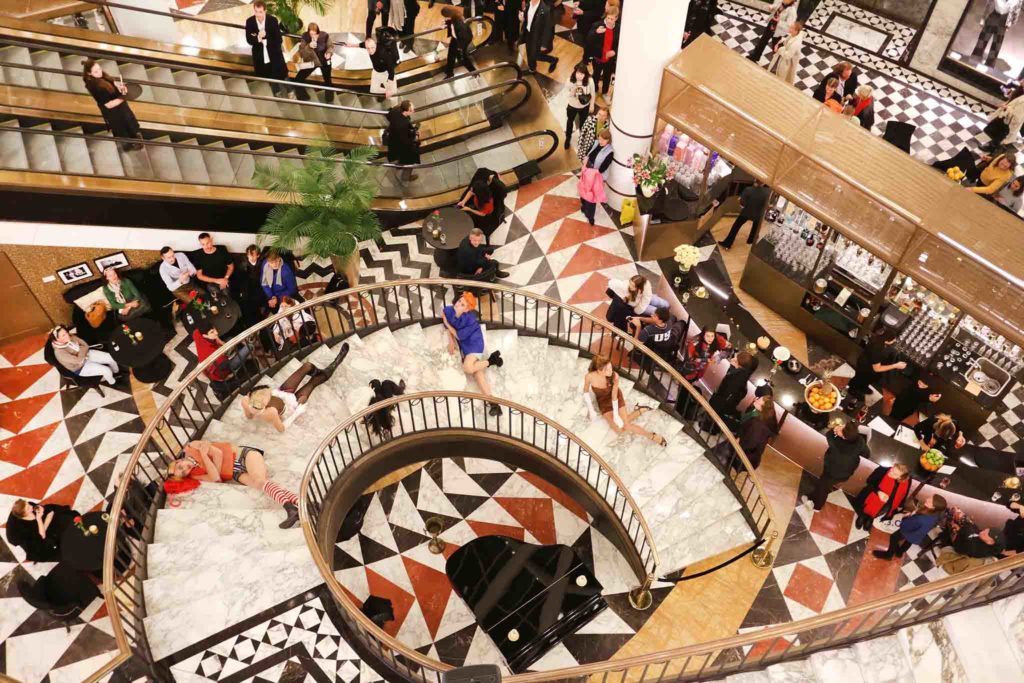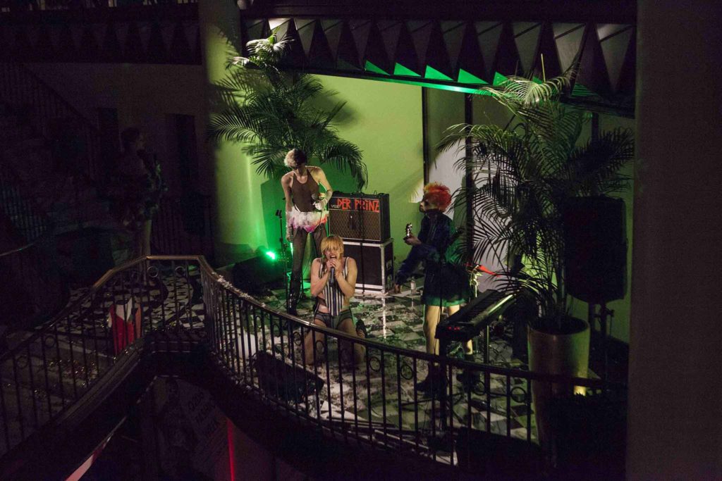 This Wednesday, Die Hässlichen Vögel perform between marble mosaic and gold splendour and sing of freedom, love and abandonment. After the fall of the Berlin Wall, the area around Friedrichstrasse and Gendarmenmarkt promised to replace the Kurfürstendamm as the luxury shopping mile for the new Berlin. In 1997, Quartier 206, built by the New York architects Pei Cobb Freed & Partners, opened its doors. With its free-floating marble staircase and a glass construction based on the Louvre pyramid, it was conceived as Berlin’s most exclusive luxury arcade. With its faux art deco splendour, the glamorous commercial property was to tie in with Berlin’s golden twenties. But Gucci, Yves Saint Laurent and Louis Vuitton have long since moved out again, the shopping temple has been under forced administration since 2011 and after Department Store 206 – the sophisticated heart of the quarter – closed in 2017, only Holmes Place is still at home here. The avant-garde punk band Die Hässlichen Vögel will clash with the marble pomp in the middle of the floating staircase. The band from Schöneberg refuses genre classifications, does not release any music and is currently planning a tour through prisons.Cast: Roman Ole, Luki von der Gracht, Josie Haar, Benji Wohlrab, Hansol „Bobo“ Kim. The concert is co-organized by Dan DeNorch.