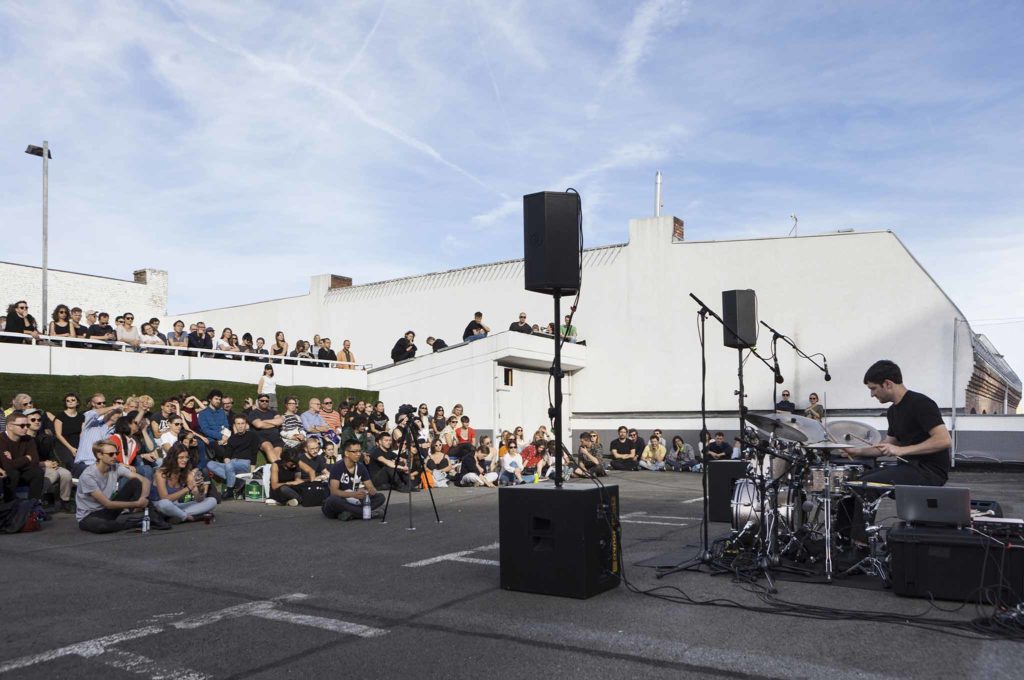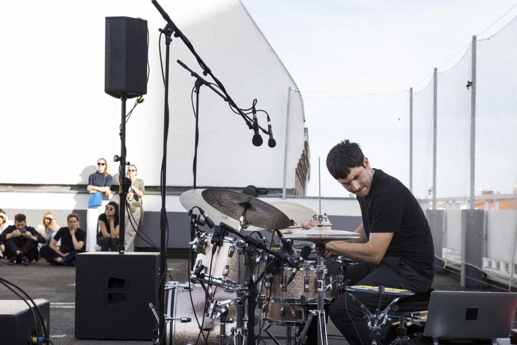 Der Komponist und Schlagzeuger Eli Keszler mischt seine eigenen Kompositionen mit dem Stadtklang des Kottbusser Tors und transportiert dabei das, was außerhalb unseres Blickfelds liegt, auf das Dach eines Parkhauses. Die ortsspezifische Sound-Performance hinterfragt unsere auditive wie auch unsere visuelle Wahrnehmung von sozialer und architektonischer Wirklichkeit. Das hinter dem Zentrum Kreuzberg, ehemals Neues Kreuzberger Zentrum, gelegene Parkhaus wurde im gleichen Zuge von 1969 bis 1974 erbaut. Trotz seiner rauen Architektur, worin es der Gegend um das Kottbusser Tor herum gleicht, verkörpert das Parkhaus in seiner Abschottung durch den vorgebauten Sozialbau eine Art erhöhter Oase. Wir können die gelebte Wirklichkeit dahinter und unterhalb lediglich erahnen oder sie aus unserer Erinnerung rekonstruieren. Was also geschieht, wenn diese Realität hörbar, aber nicht sichtbar ist? Und wie hängt das mit der menschlichen Fähigkeit zu Empathie, Teilnahme und Fürsorge zusammen?