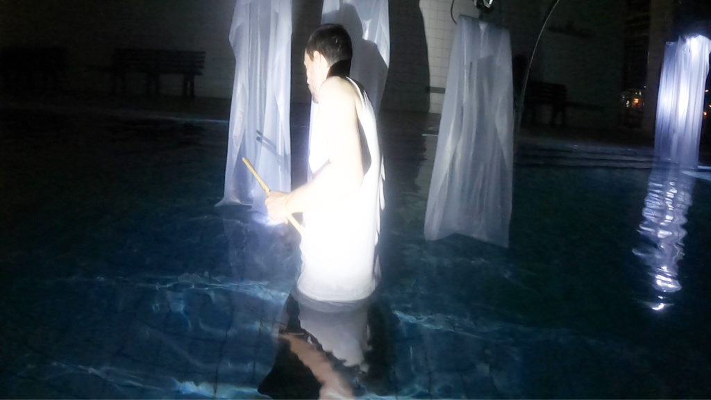 Der dreiteilige Abend erstreckt sich über mehrere Becken des Wellenbads. Abelsons skulpturale und instrumentale Interventionen treffen auf Bultheels ortsspezifische Komposition für vier Musiker*innen, wobei sich das gemeinsame Interesse der beiden Künstler*innen an der Präsenz des Raums im Klang und umgekehrt zeigt.