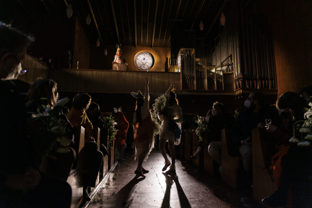 Following the hyperbolic comedy CROCCOPAZZO! (2020), Il Matrimonio di Immacolata is the second piece of an evolving trilogy. The ceremony guides us through the complexities and conflict we experience in our yearning for closeness and self-actualization, devotion and independence. In sinister dialogue with the liturgical, social and institutional realities of the act of marriage, the performers find themselves in an unforeseeably fragile construct in their search for romantic and personal fulfillment.