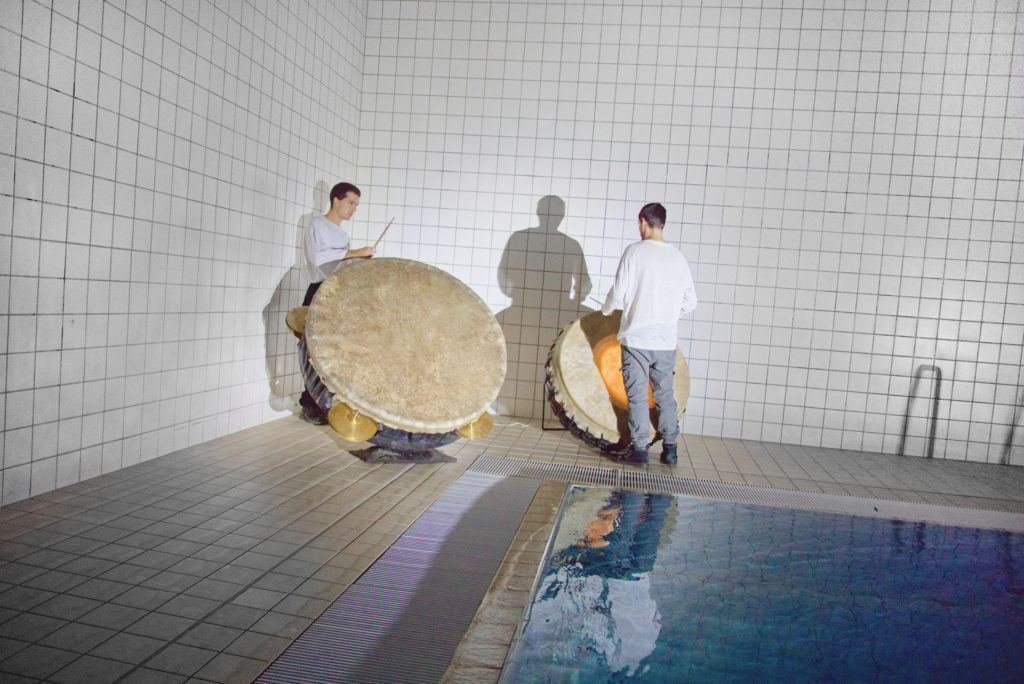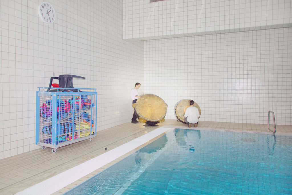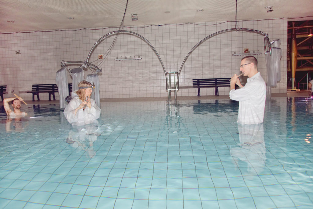 Billy Bultheel understands the different halls of the pool as resonance chambers thereby drawing an analogy to the acoustics of baroque architecture, deepening his research on Renaissance compositions and the then common inclusion of architecture in the composition itself: The pool complex thus becomes an architectural extension of an immersive composition. Viviana Abelson, who works with sculptures and installations, designs and builds the instruments for which the music is composed. Her practice in instrument making combines historical research with an industrial perspective to create new sound and instrument-specific performance methods.